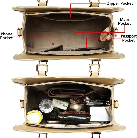 Women's Fashion Handbags Tote Bags Shoulder Bag Top Handle Satchel Purse Set 4Pcs - Beige